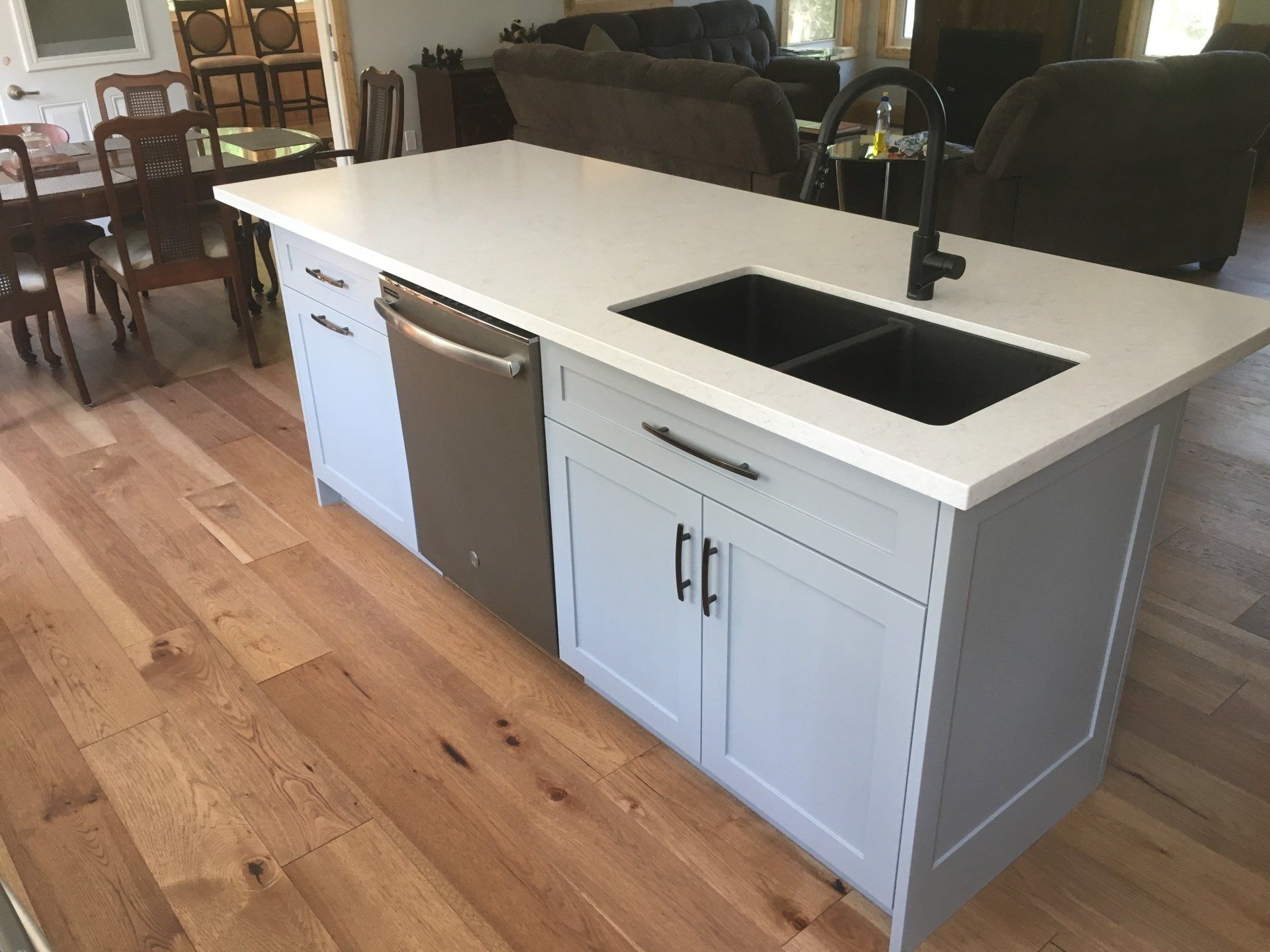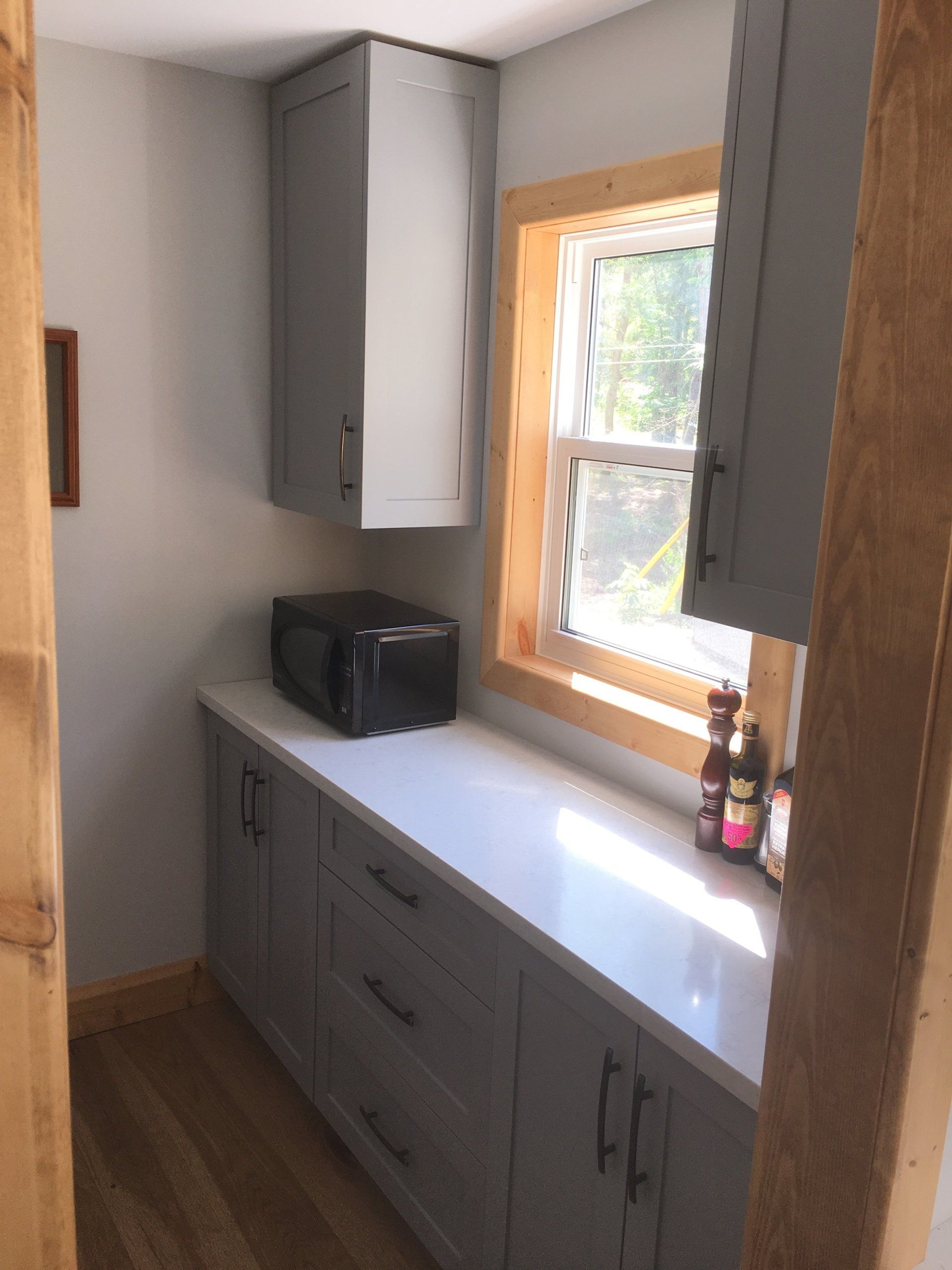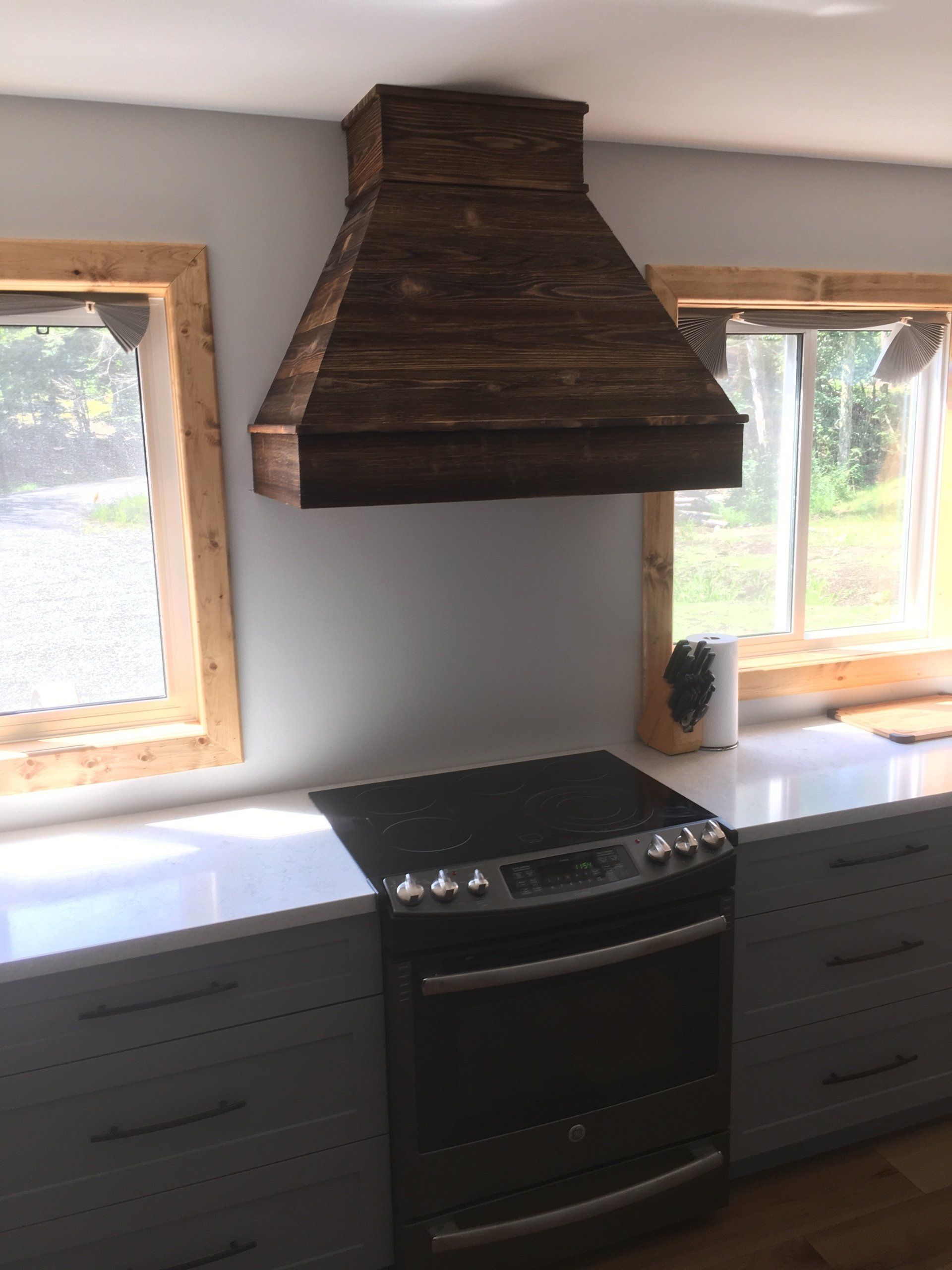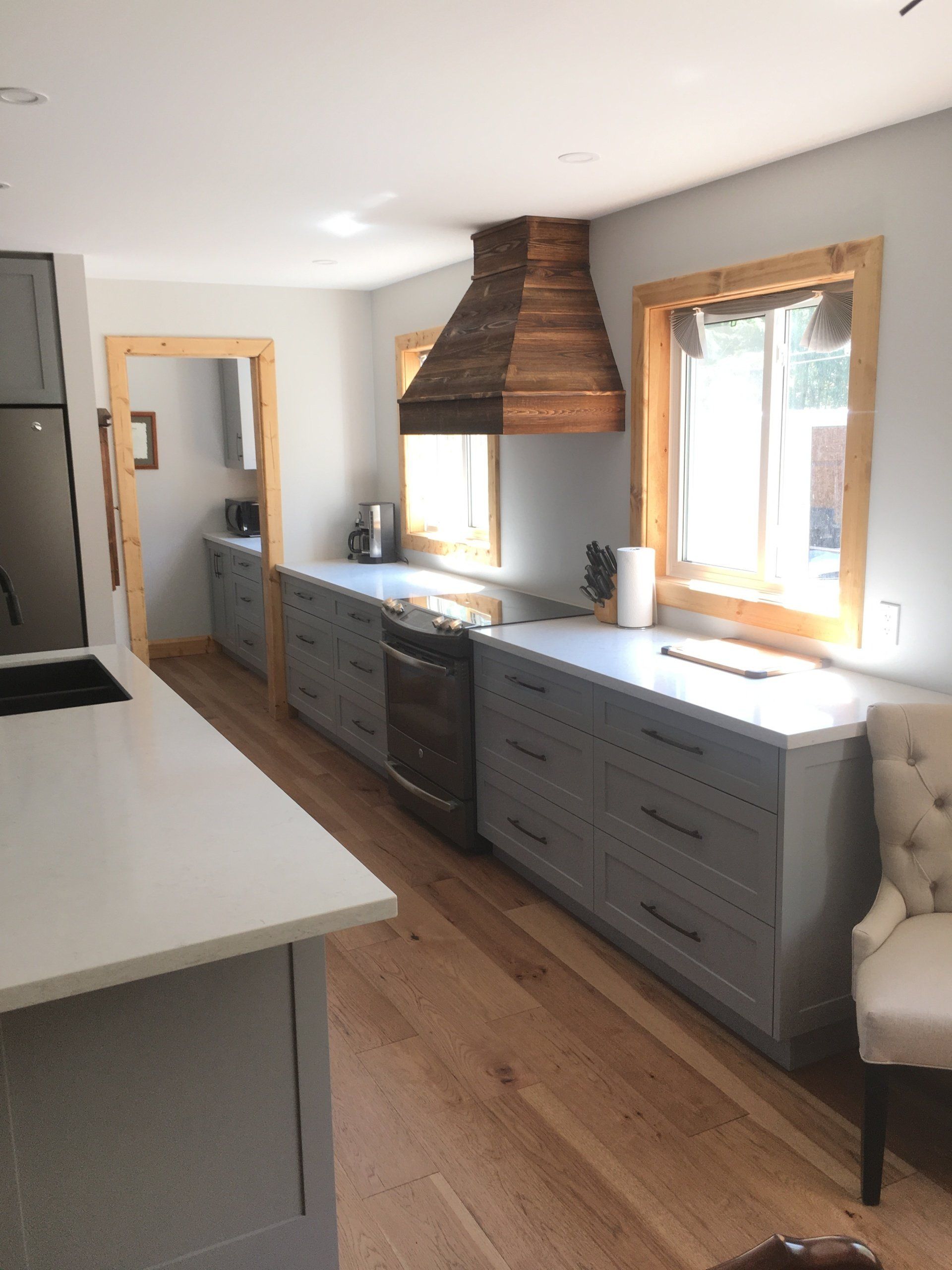 This Kitchen is in a beautiful cottage on Oastler Lake in Parry Sound. The perfect amount of contrast is given from the cabinetry, which is painted AF-700 - Storm by Benjiman Moore, to the white quartz tops and the charred cedar range Hood.