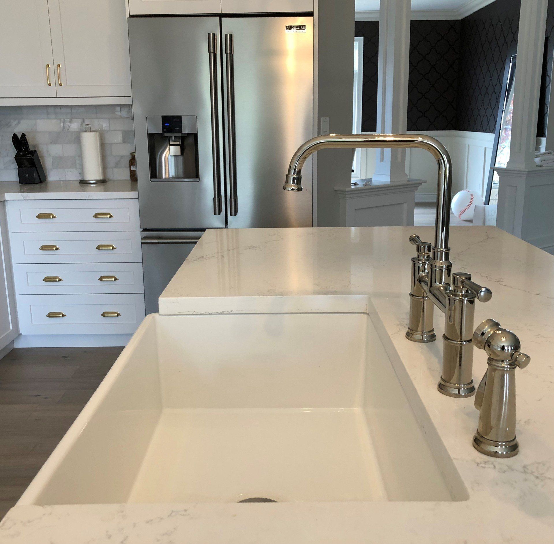 This kitchen was design to have everything! Custom Hood, Apron Sink, Brass hardware and fixtures come together to make this one a show stopper!