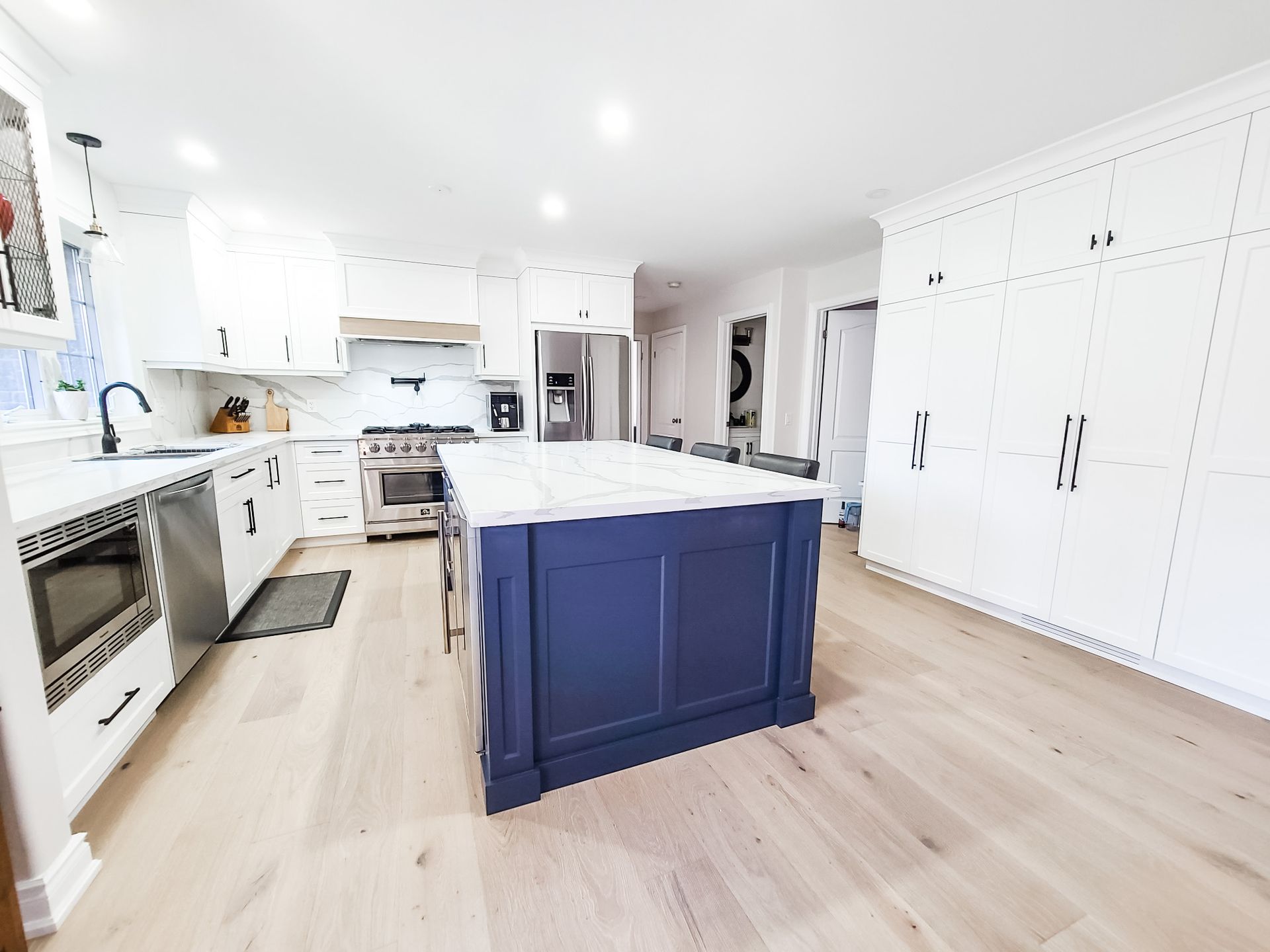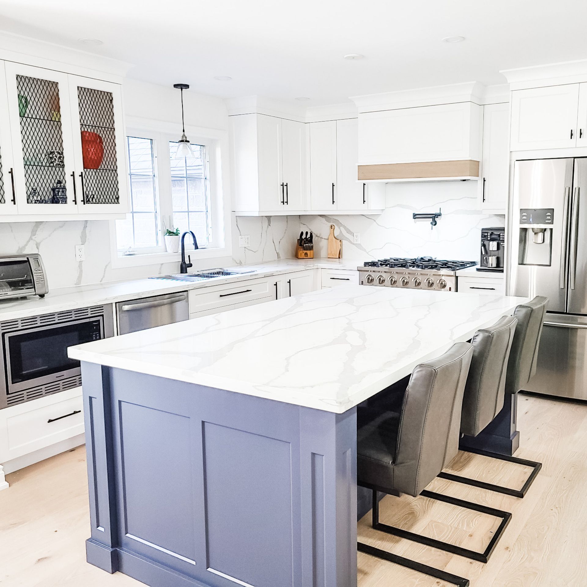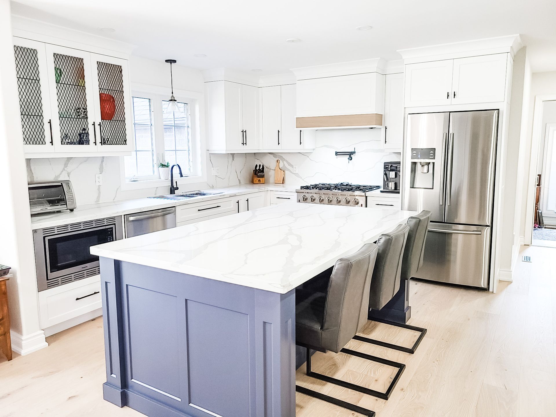 This timeless kitchen consists of Chantilly Lace perimeter cabinetry with a stunning Hale Navy Island. Accents of black metal and wood help bring it all together.