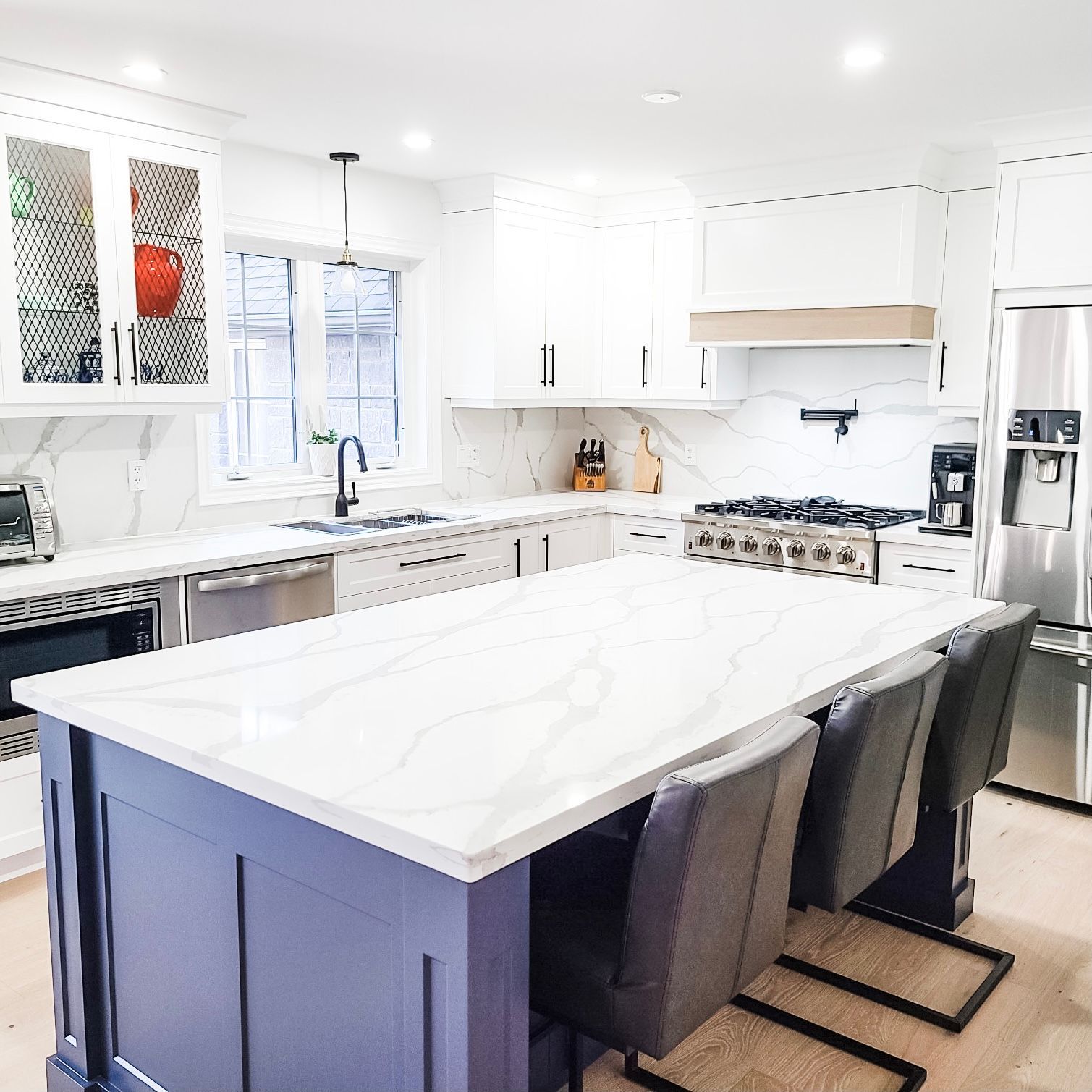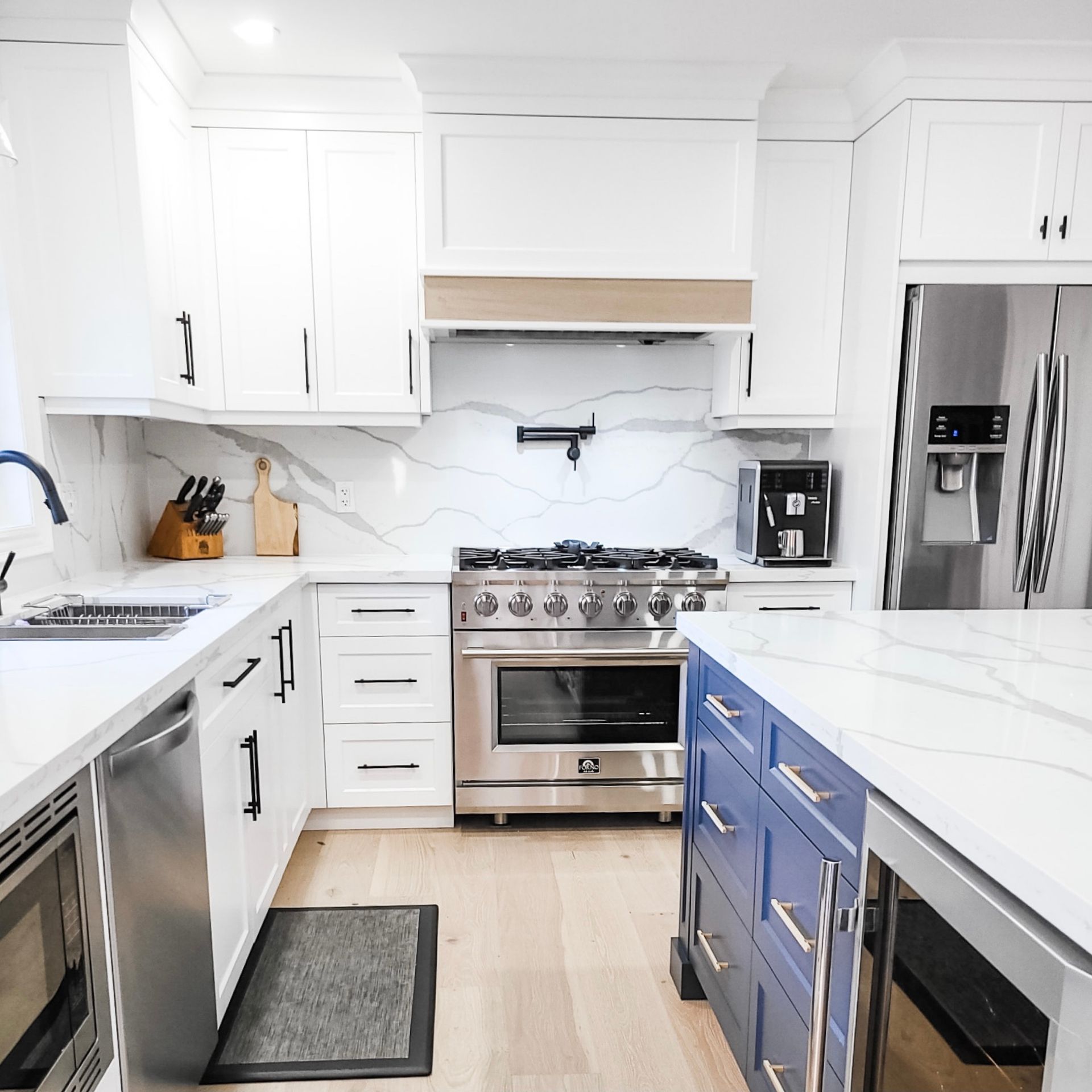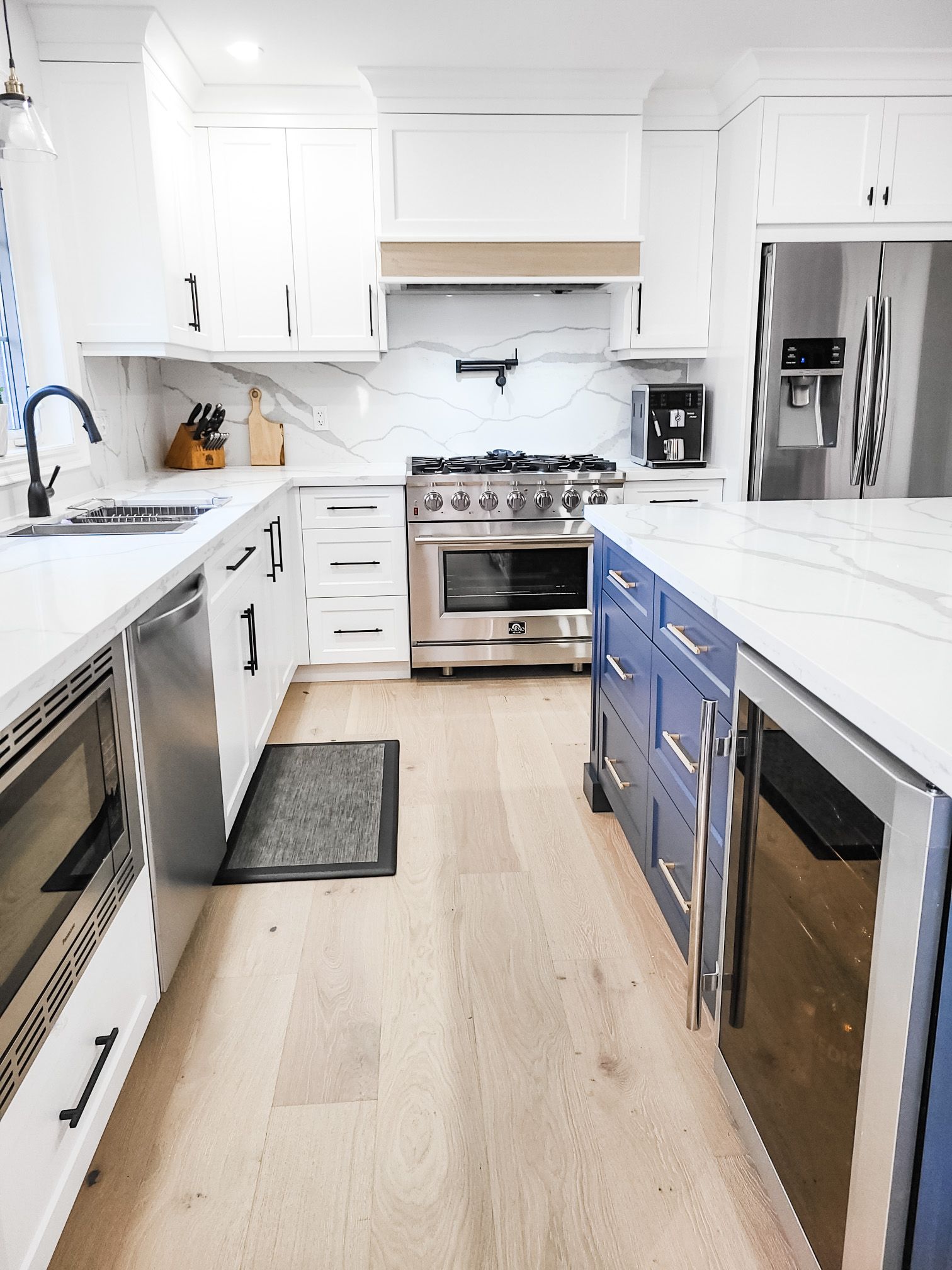 This timeless kitchen consists of Chantilly Lace perimeter cabinetry with a stunning Hale Navy Island. Accents of black metal and wood help bring it all together.