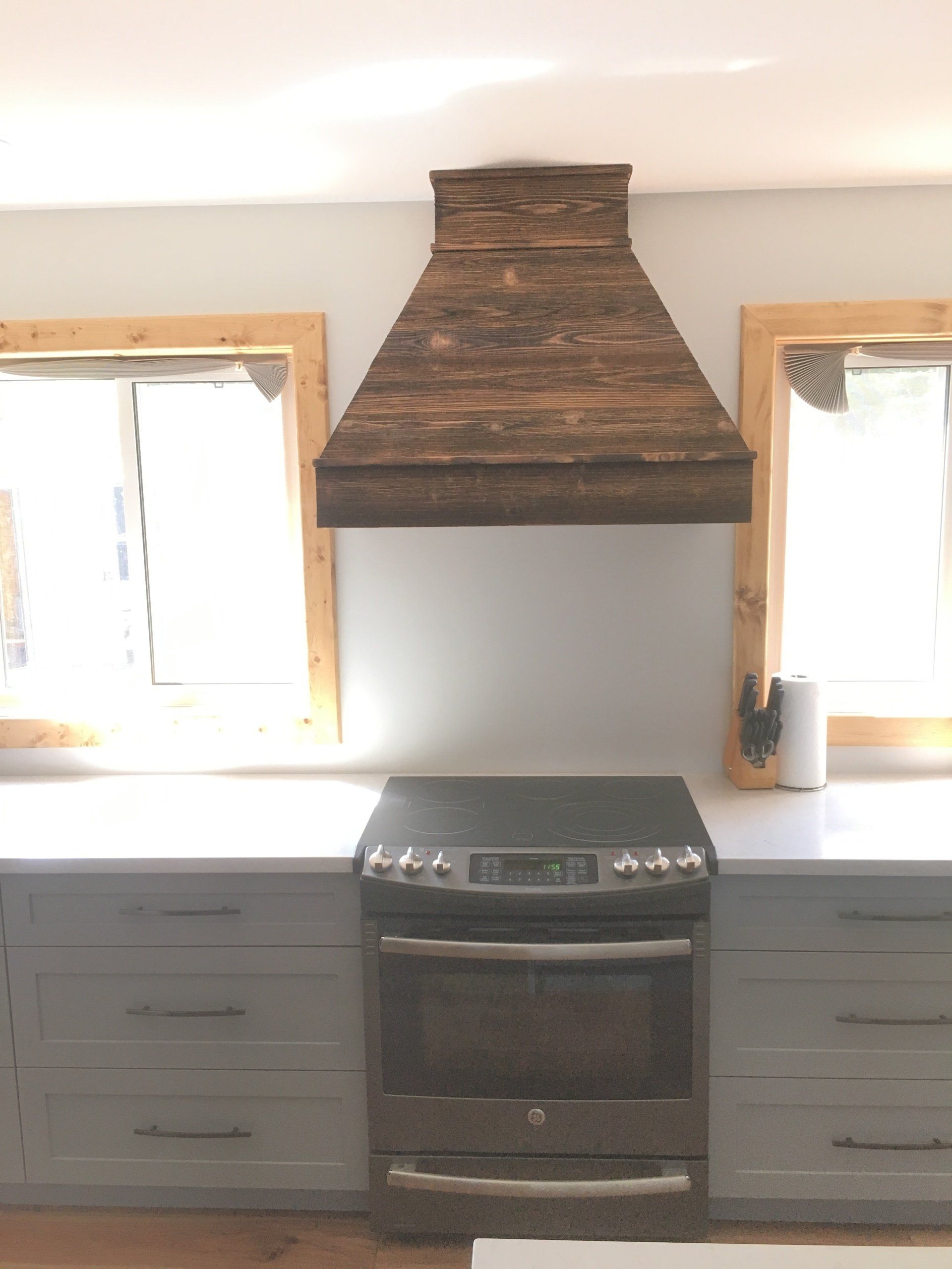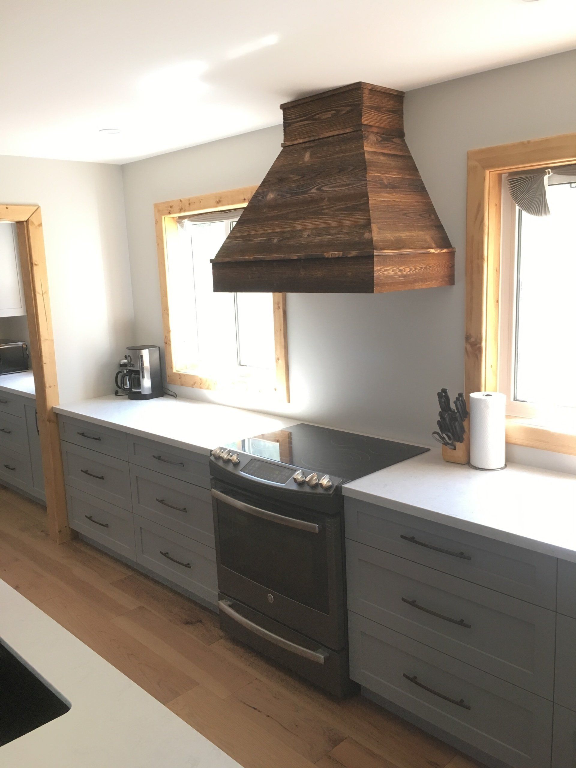 This Kitchen is in a beautiful cottage on Oastler Lake in Parry Sound. The perfect amount of contrast is given from the cabinetry, which is painted AF-700 - Storm by Benjiman Moore, to the white quartz tops and the charred cedar range Hood.